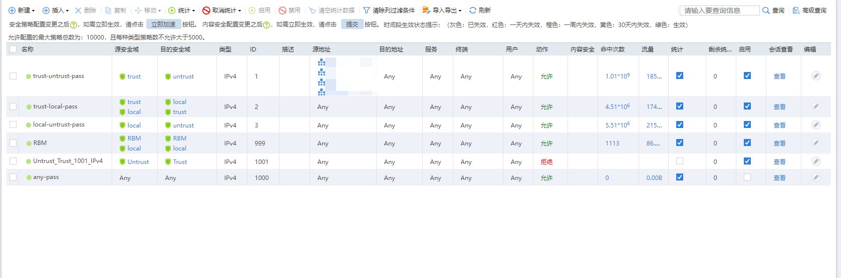 当前防火墙设备的安全策略如下:需要精细优化。每一条的策略用途能直接看出来吗?我现在不知道第二条和第三条是干嘛的。不知道具体把any到any改成哪个地址段或者地址。