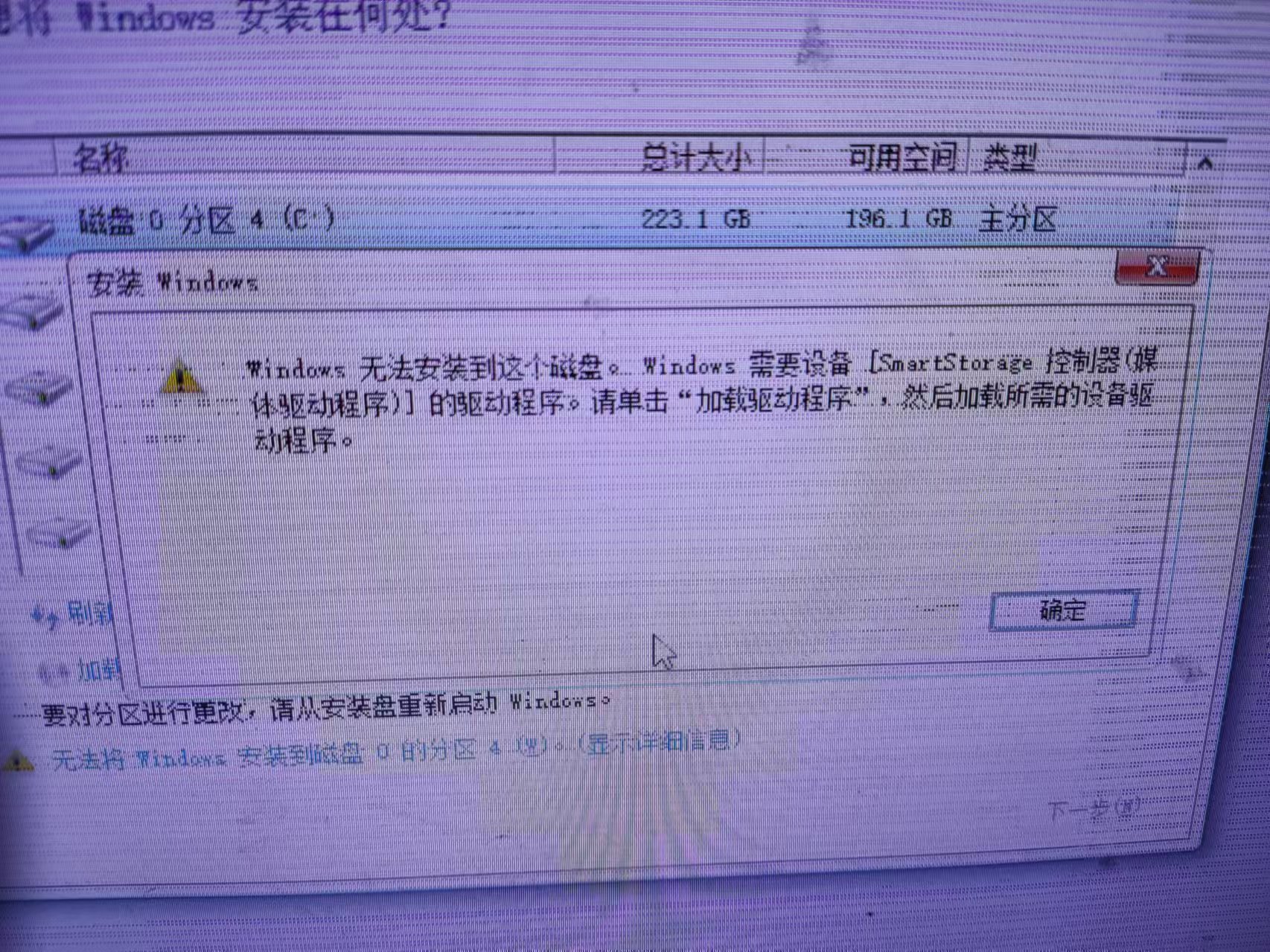 在安装windows2012R2操作系统时,进行到选择磁盘那一步报错windows无法安装到磁盘,windows需要设备[SmartStorage控制器(媒体驱动程序)]的驱动程序。