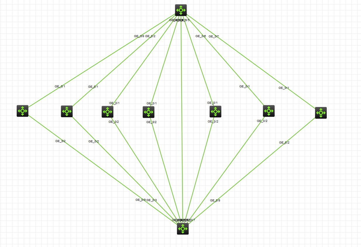 我在HCL模拟器中搭建了如下拓扑,计算OSPF的COST值,全部配置完成后发现中间一排的交换机只能同时与上下其中一台交换机建立OSPF邻居,例如与上面的交换机建立邻居后,中间的交换机甚至无法ping通与下面交换机的互联地址,这时候如果把上面交换机关闭,中间一排交换机即可ping通下面交换机的互联地址并建立OSPF邻居;想请教下各位大佬看怎么回事?是模拟器的问题亦或者是我配置的不够完善,求解答