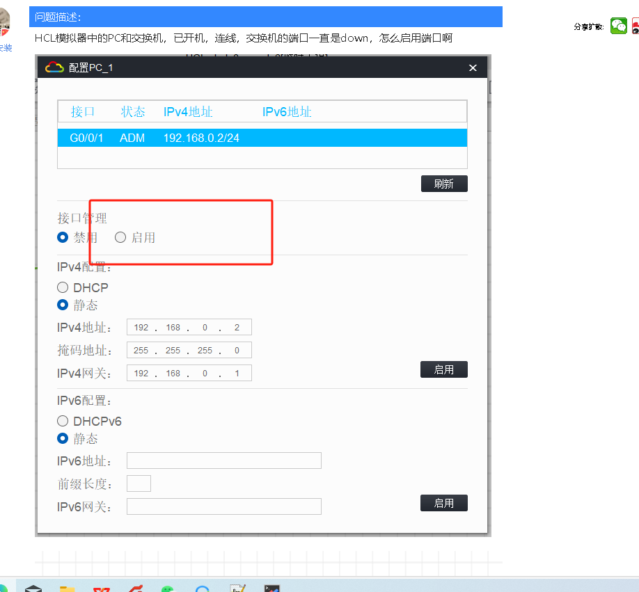HCL模拟器中的PC和交换机,已开机,连线,交换机的端口一直是down,怎么启用端口啊