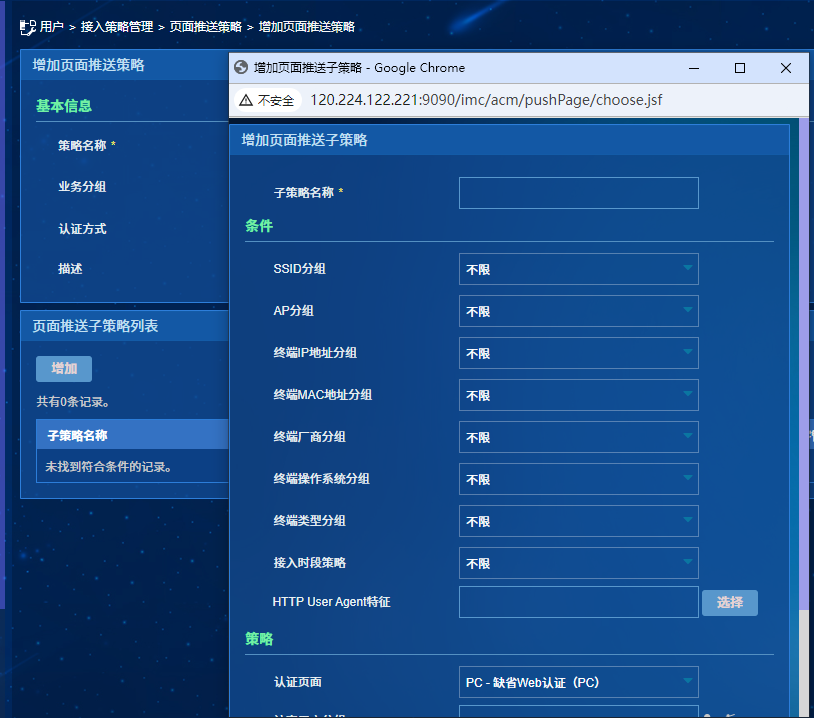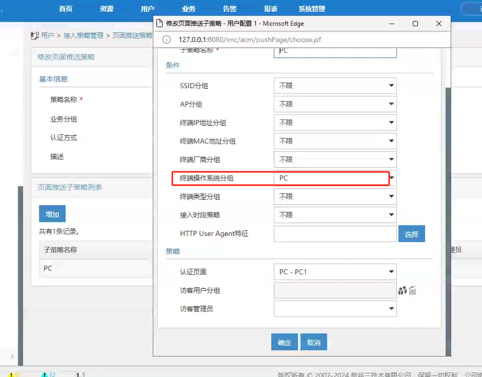 2、页面推送策略选中刚新建的操作系统类型PC,然后推送认证页面选PC的portal页面