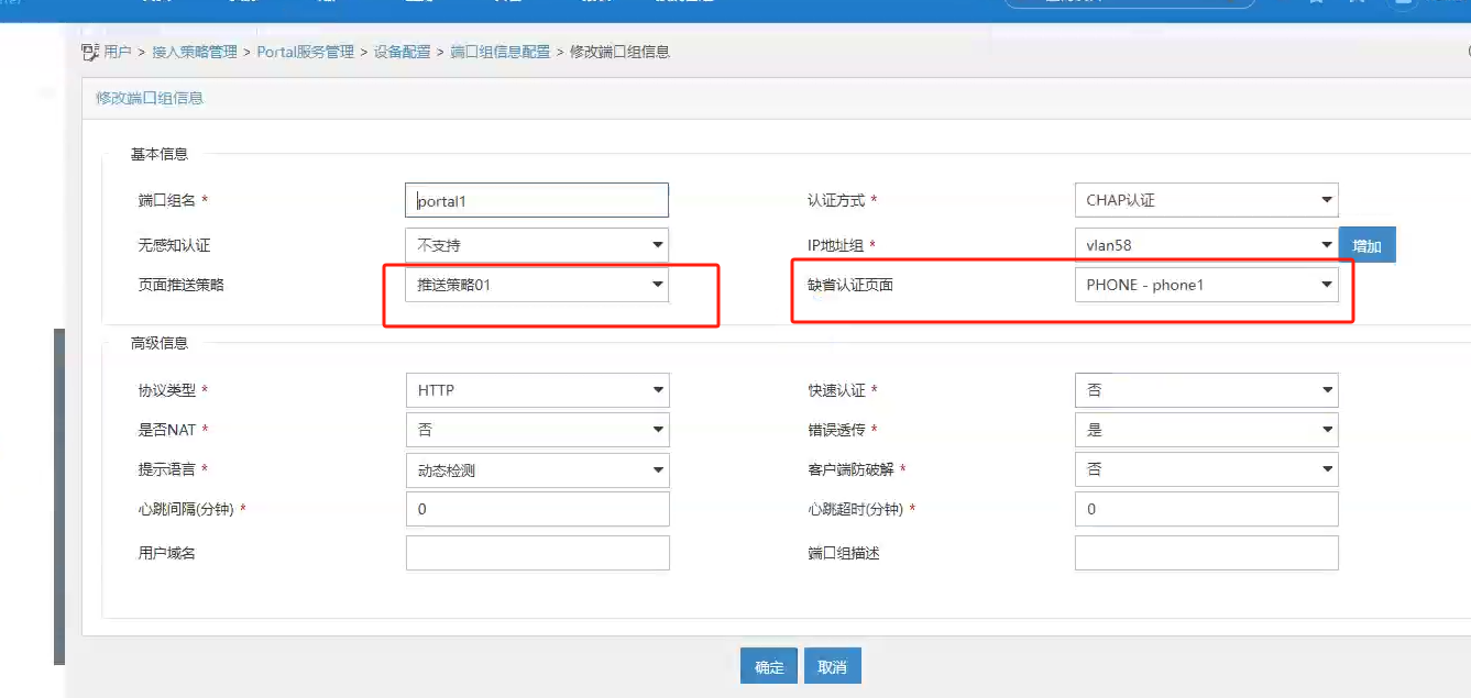 3、端口组里面选缺省是推送手机页面,如果页面推送策略识别到系统是windows等,就推PC页面,我这里是采用识别pc系统的方式,也可以识别手机系统的方式,如果用识别手机的方式,第一步就只把安卓系统和苹果系统勾上了。还有一种方式是识别HTTP User Agent特征的