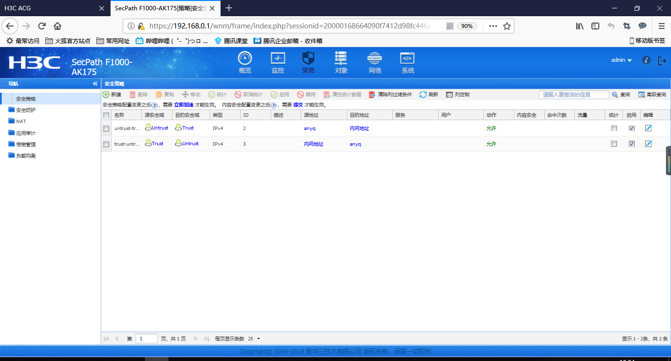 尝试放行了,但是还是ping不通,而且我只是测试防火墙trust域下14口到AC之间的链路,应该是不涉及域间策略的问题吧