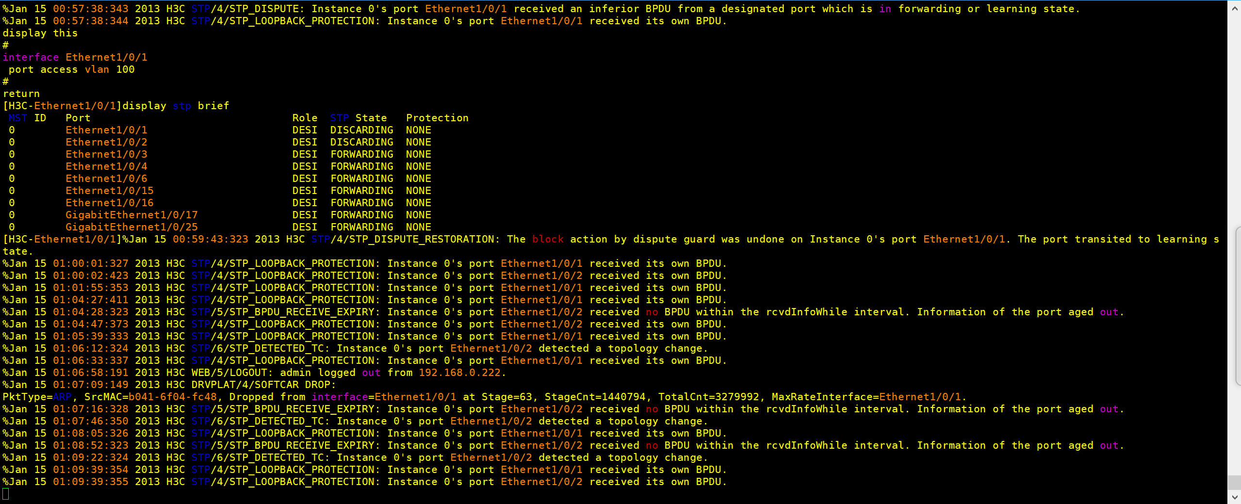 触发stp dispute 机制是因为这台 E1/0/1端口收到了其它交换机指定端口发出的低优先级STP BPDU,就保护性关闭了。