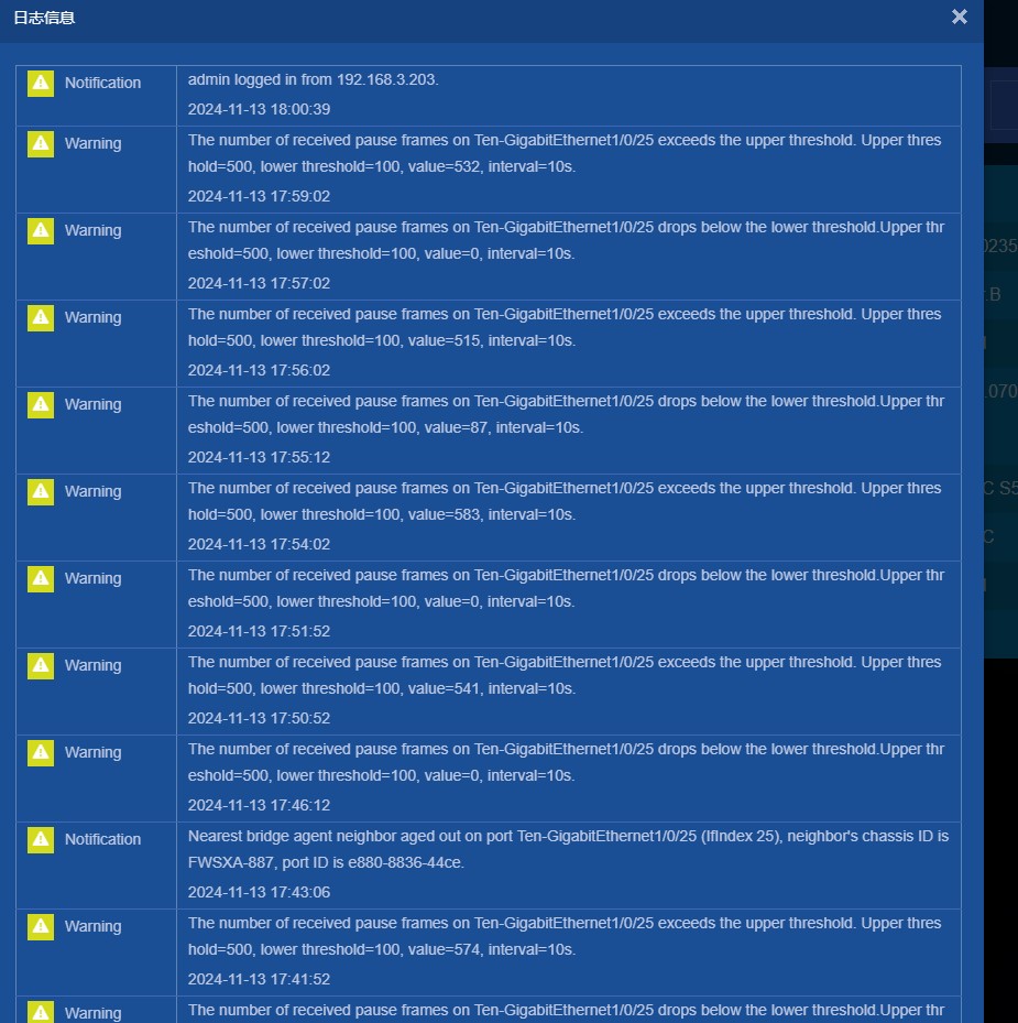 您好,接收到过多的暂停帧(pause frames)通常表明交换机端口的网络流量正在达到或超过其处理能力,这会导致网络拥塞和性能下降。暂停帧是网络设备用来控制流量的一种机制,用于告知对方设备减少发送数据,以防止网络拥塞。这里的警告说明你设备的某些端口正在频繁接收到这样的暂停帧,超出了设定的阈值。