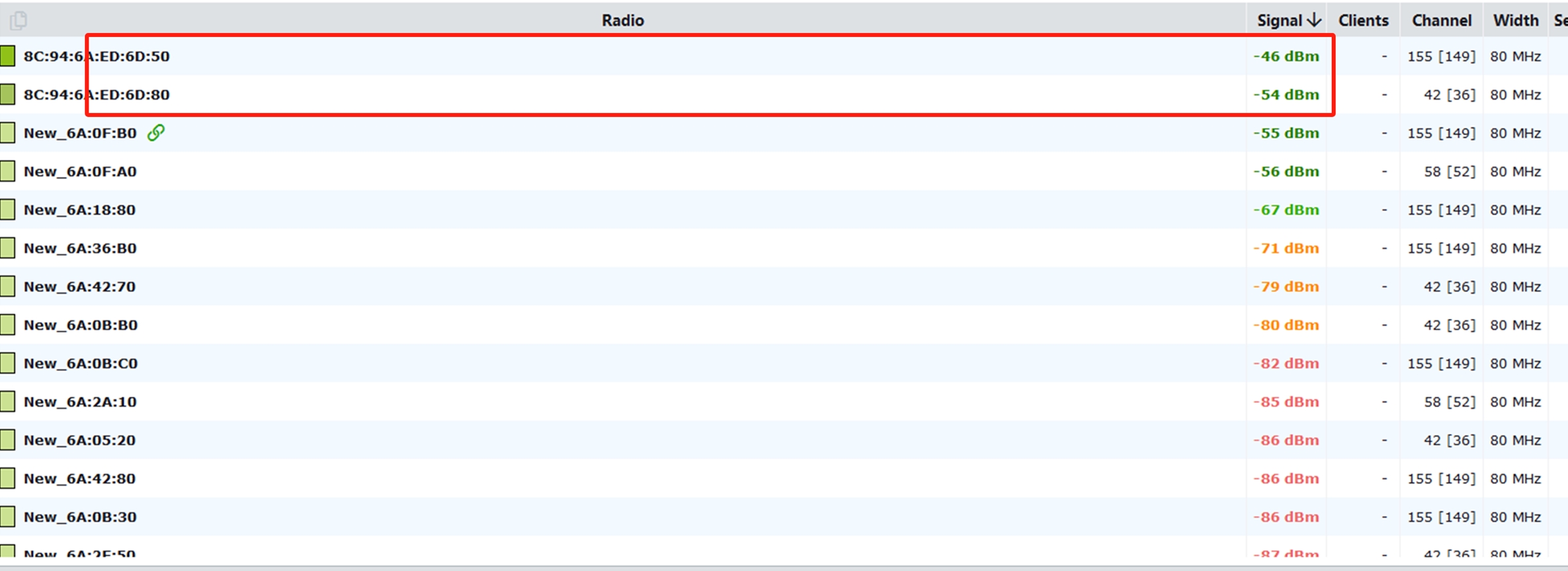 检查了一下频宽都是80MHz,不过让这个用户安装了inSSIDer看了一下,从这个终端上看居然确实6和8号AP信号很弱。这就很神奇了。