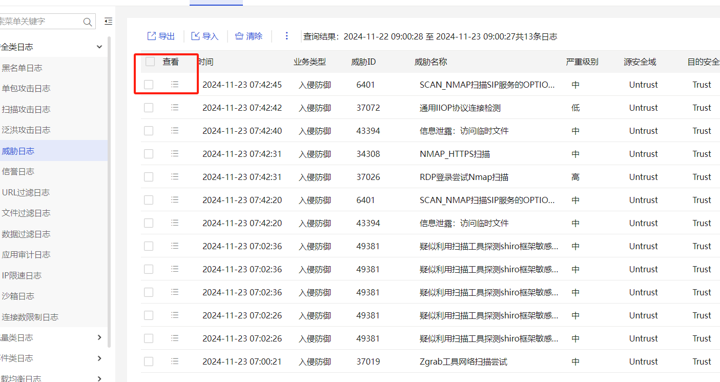 你点以下这里,应该是能打开详细的信息,你看动作是允许,告警,丢弃还是阻断,就能知道了