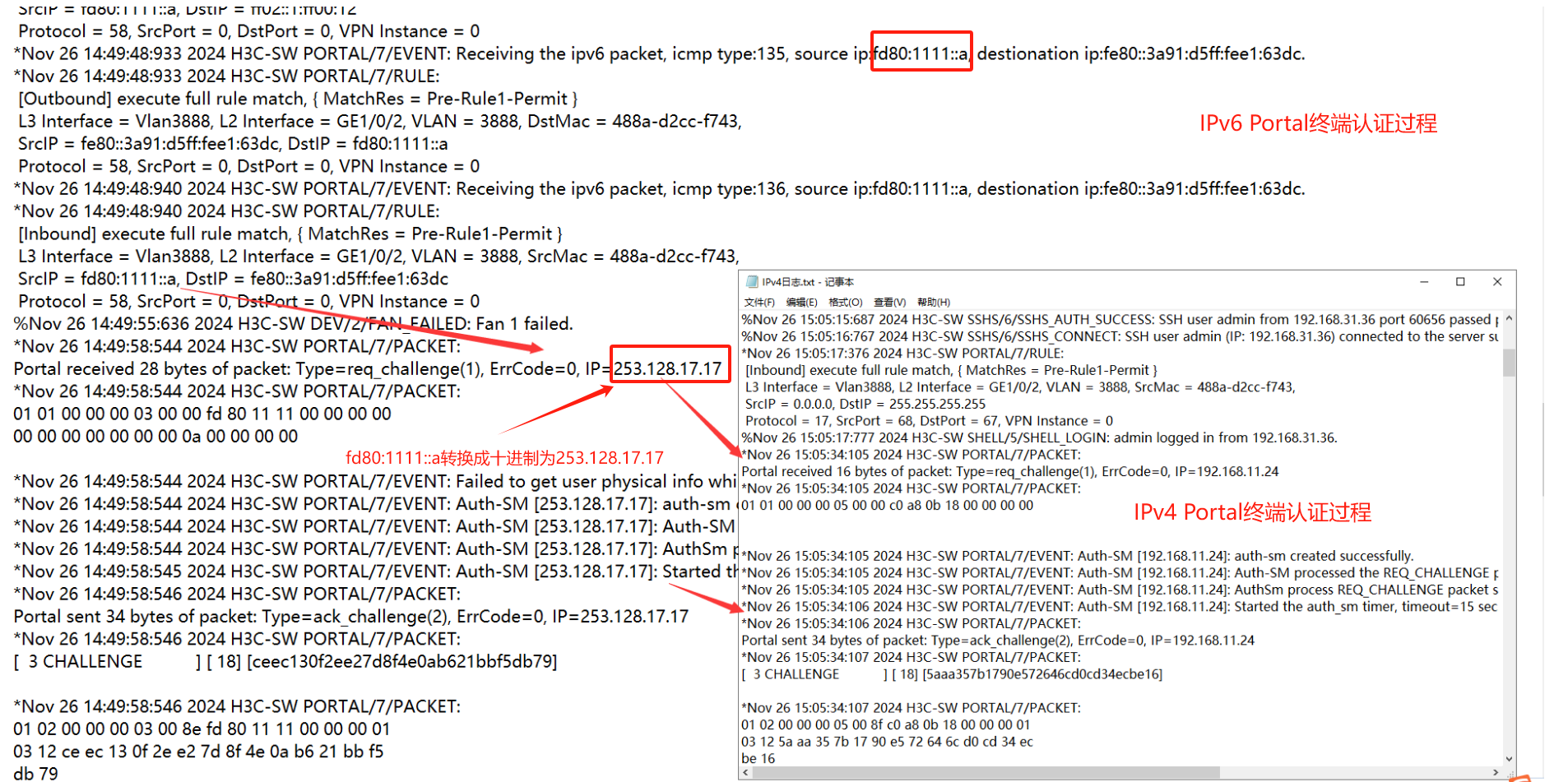 认证方式采用第三方认证,终端获取IPv6地址以后,在自动弹出的认证页面中进行登录时认证失败,通过交换机debuging,看到交换机将原本终端的source IP地址自动转换成了十进制的253.128的地址,导致认证失败。
