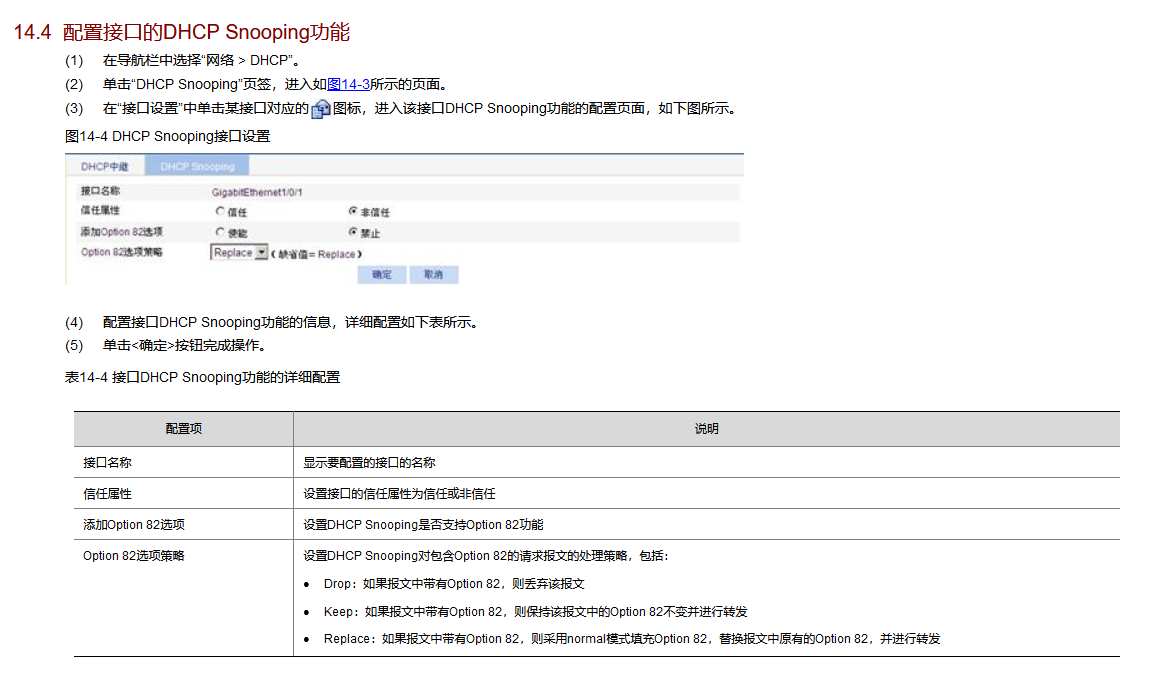 (4) 配置接口DHCP Snooping功能的信息,详细配置如下表所示。
