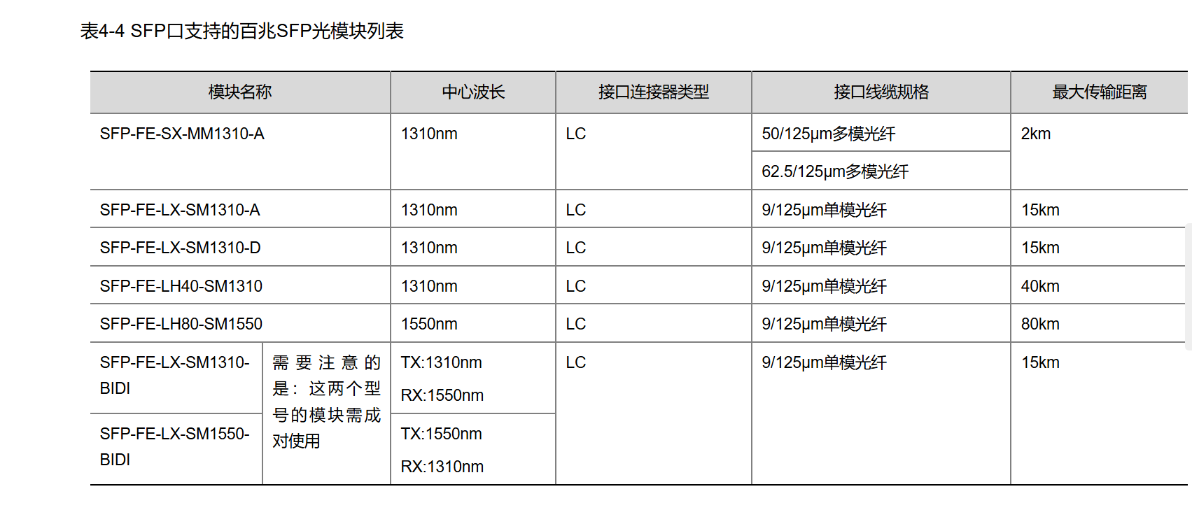 SFP-FE-LX-SM1310-BIDI | 需要注意的是:这两个型号的模块需成对使用 | TX:1310nm RX:1550nm | LC | 9/125µm单模光纤 | 15km |