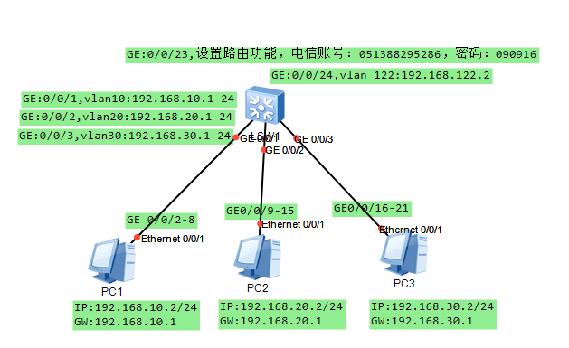 交换机为H3C S5800-32C,需实现三个功能:(1)GE0/0/23,设置路由功能,连结电信光猫,交换机拔号,账号和密码见示意图,GE0/0/24设置交换机WEB登陆页面;(2)划分在三个VLAN,VALN10对应端口1-8,VLAN20对应端口9-15,VLAN30对应端口16-22。(3)VLAN20内PC可访问VLAN10、30的PC,但不可外网,VLAN10\30的电脑即可VLAN互访,也可上外网。
