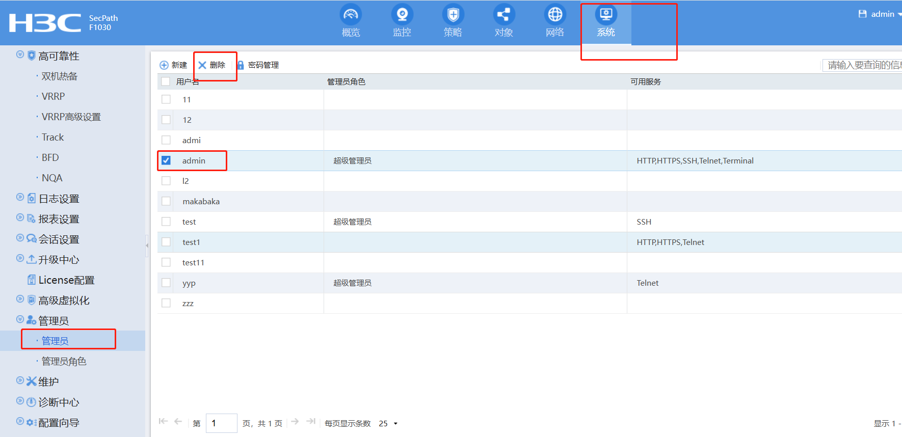 F1000系列防火墙,等保要求不能有默认的超级管理员账号,如何禁用或删除默认超级管理员账号?