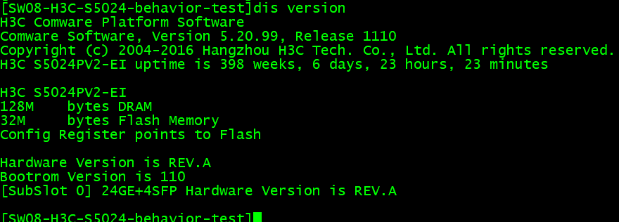 H3C Comware Platform Software Comware Software, Version 5.20.99, Release 1110 Copyright (c) 2004-2016 Hangzhou H3C Tech. Co., Ltd. All rights reserved. H3C S5024PV2-EI uptime is 398 weeks, 6 days, 23 hours, 25 minutes H3C S5024PV2-EI 128M bytes DRAM 32M bytes Flash Memory Config Register points to Flash Hardware Version is REV.A Bootrom Version is 110 [SubSlot 0] 24GE+4SFP Hardware Version is REV.A