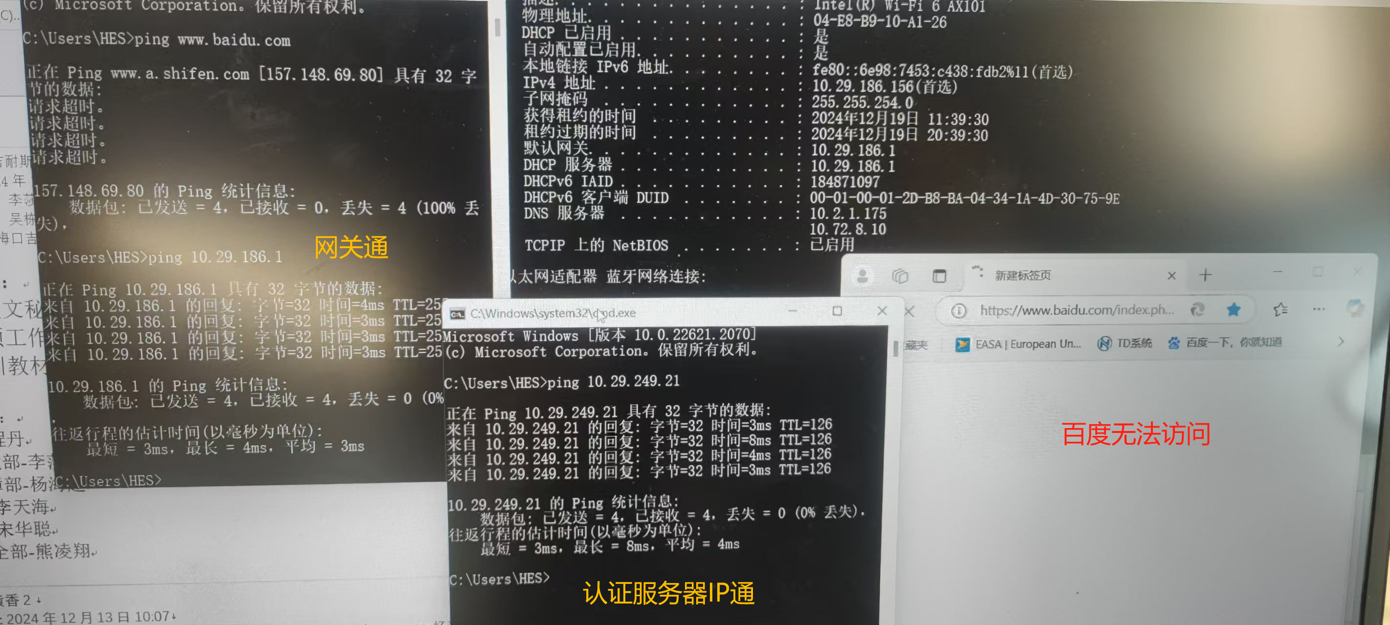 3. 账号3 笔记本早上在办公区认证成功,带到一楼正常,去了厂房断网,回来以后一直无法联网,无法弹出认证。网关通,认证服务器IP通,清除终端在线信息和强制下线后,长时间无法恢复,手动访问portal页面显示上线,手动下线后无法再打开认证页面。地址甚至会自己跳到2.2.2.2。