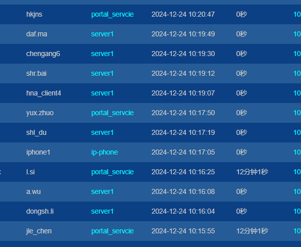 portal_service服务名的终端,有的可正常显示在线时长,有的全是0秒。但是0秒的终端大部分也都能正常联网,只是每天3-6个终端会断网。认证服务名server1的终端在线时长全是0(因为没有故障,暂时不做讨论)。