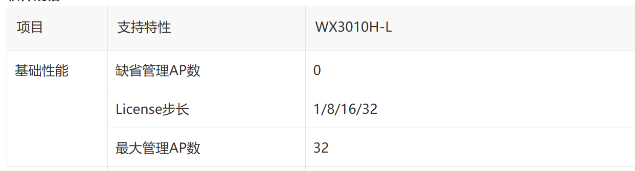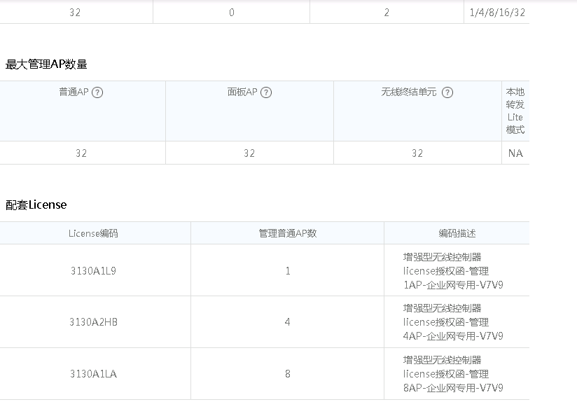 上官网看了最多支持64个,在“支持的AP License BOM编码”的“3130A2HC(64 AP)”如下图,不知什么意思,目前已有30个,所以到底是支持64个还是32个ap