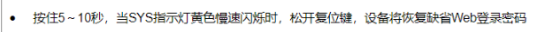 从产品用户手册看到“按住5~10秒,当SYS指示灯黄色慢速闪烁时,松开复位键,设备将恢复缺省Web登录密码”,请问这样设备配置会不会丢?是不是只是web密码恢复成缺省密码?