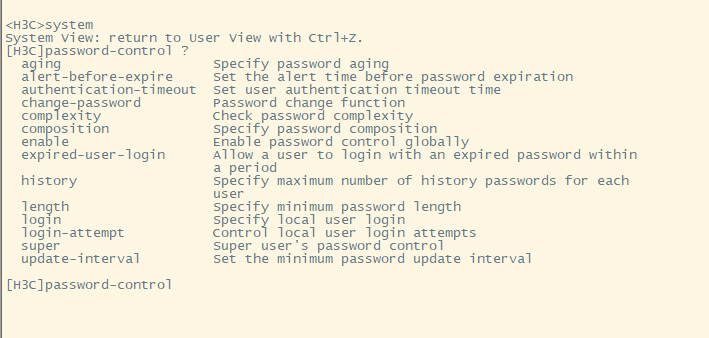 password-control login-attempt 5 exceed lock-time 15 //指定密码尝试最多5次,失败5次后被锁定15分钟