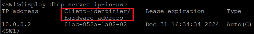 首先这个字段不叫mac address,他叫做Client-identifier/Hardware address(客户端标识 或 硬件地址)。意思就是如果客户端请求里携带option 61,那么他就显示客户端标识(一般就是01+mac地址,01代表以太网类型);反之如果客户端请求里没有option 61,那么他就直接显示硬件地址(一般都是以太网,那就是直接显示mac地址,这样前面就没有01了)。