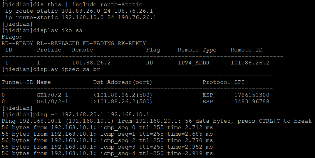 *Jan 13 10:47:30:851 2025 jiedian IKE/7/EVENT: -COntext=1; vrf = 0, local = 198.76.26.2, remote = 101.88.26.2/500