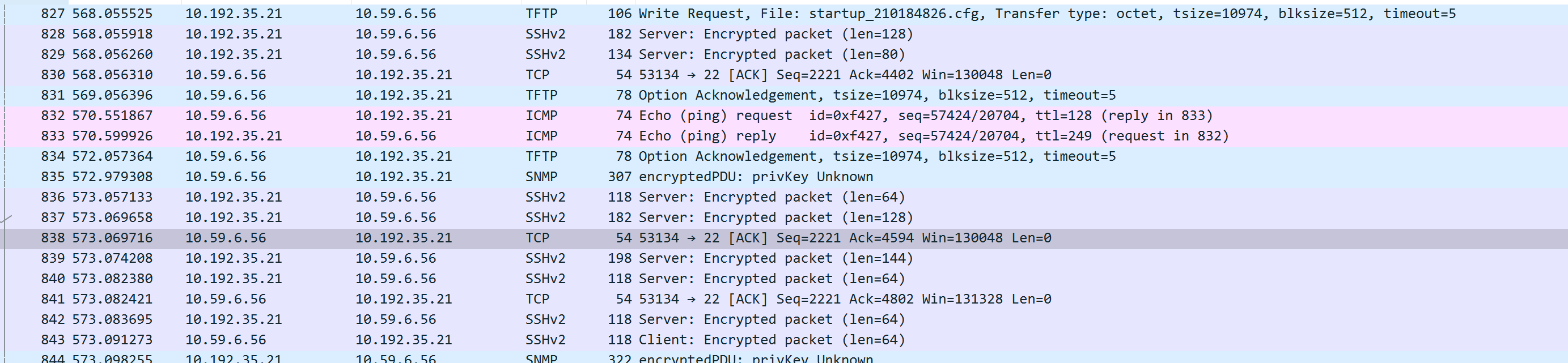 tftp传输文件提示超时,手动在设备上向imc服务器传输文件,中间防火墙放通了设备ip,imc服务器上防火墙也都关闭了,我看ack连接应该是正常建立了,还有什么可能性吗