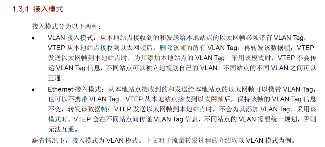 我一直想找个,就是vtep怎么处理本地站点发来和发给本地站点vlan标签是怎么处理的,像以前access/truck模式那样讲的很细,允许那些vlan,怎么打上,怎么去掉之类的。