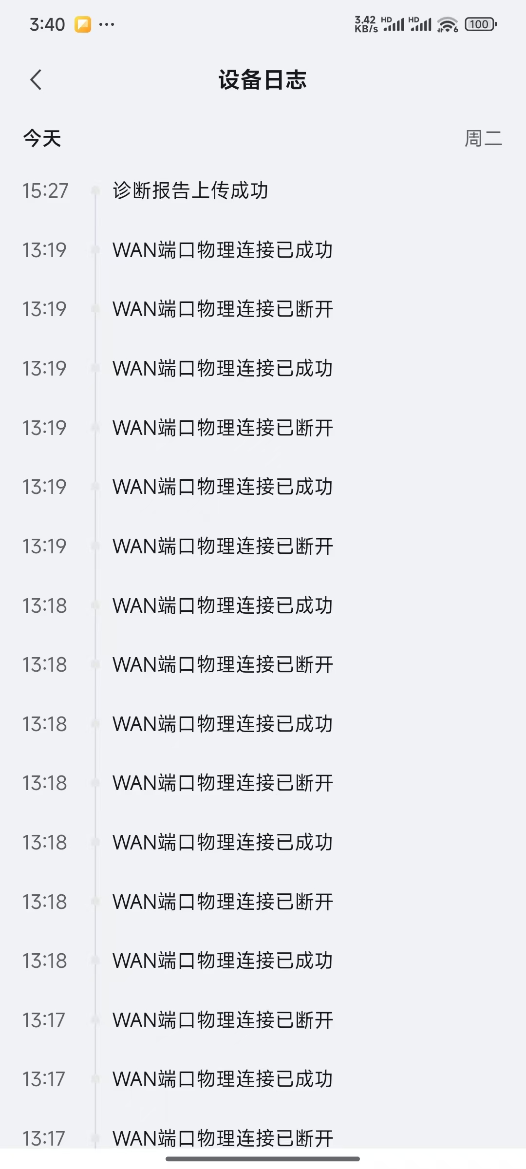 NX30 pro(序列号:219801A4QC623BL00BK6,已通过APP上传故障信息)。该路由器在一天特定的某几分钟,会出现wan口异常状态。出现该情况时,会显示wan口物理连接已断开,然后在3-4秒内回复,并记录wan口物理连接已连接。每次循环之间没有特别的时间间隔特点,但每次断开后重连时间在3-4秒内,绝不超过4秒。已更换光猫确定为非光猫问题,亦更换连接用网线,确定为非网线接触不良导致。
