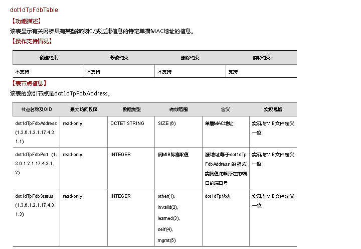 这不等于没说么,看了官方的,这个是RFC4188的标准,dot1dTpFdbTable(1.3.6.1.2.1.17.4.3.1.1/2/3),但是咱们的交换机根本就不能使用,没有这个OID