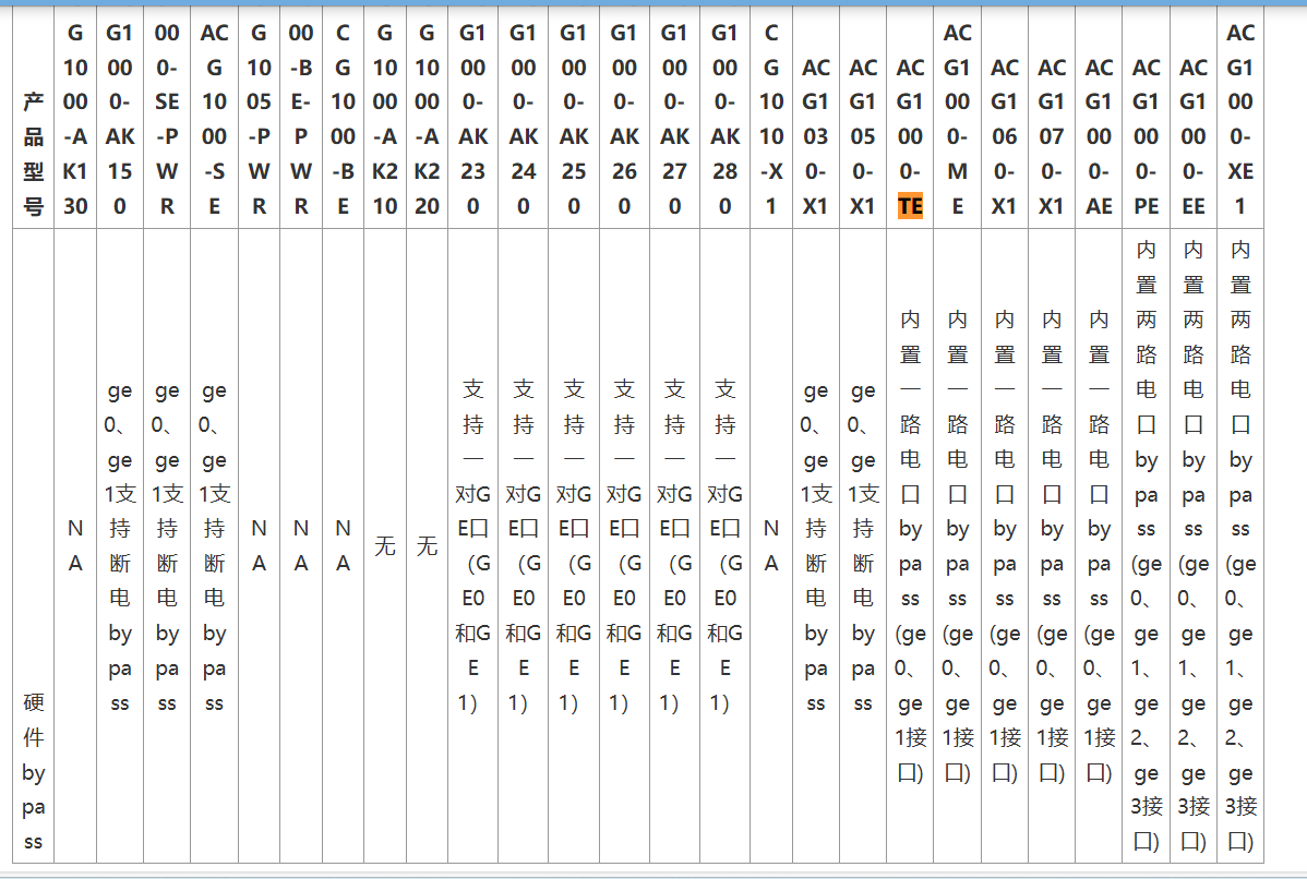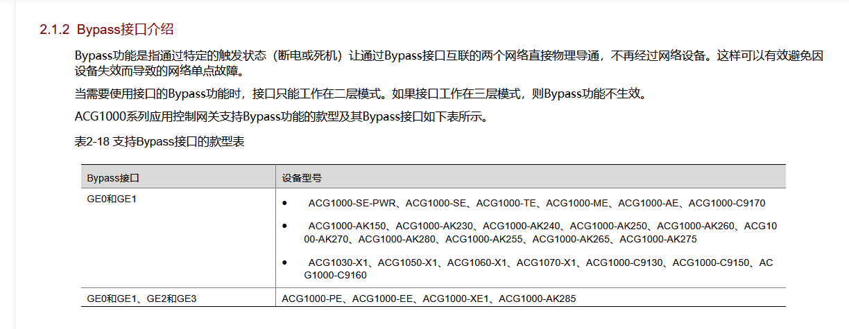 ACG1000系列应用控制网关支持Bypass功能的款型及其Bypass接口如下表所示。