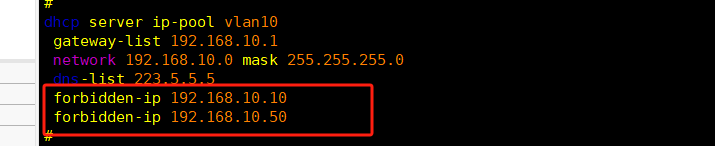 dhcp server forbidden-ip命令用来配置全局不参与自动分配的IP地址。