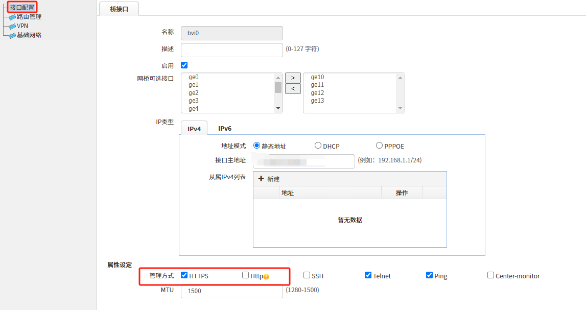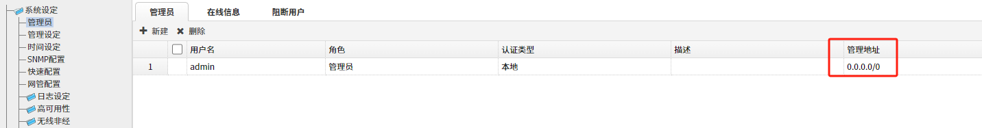 设备管理口的IP地址 | · 接口号:GE0/MGT接口 · IP地址:192.168.1.1/24 | MGT接口为设备的默认管理口(无MGT接口的设备默认GE0口为管理口) 默认允许对该接口进行PING,HTTPS操作。 |