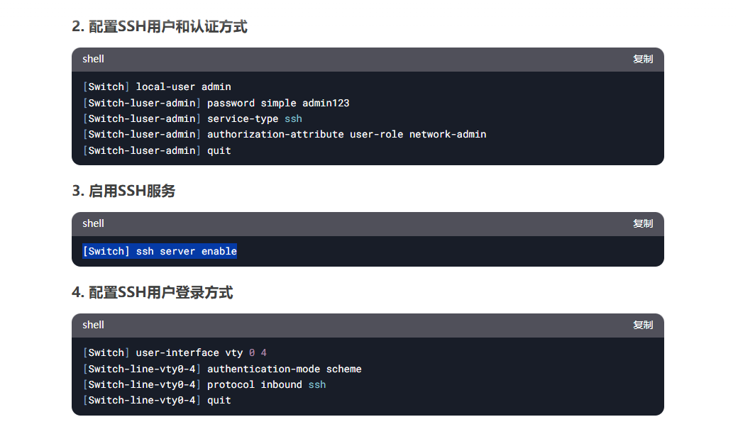 [Switch] local-user admin [Switch-luser-admin] password simple admin123 [Switch-luser-admin] service-type ssh [Switch-luser-admin] authorization-attribute user-role network-admin [Switch-luser-admin] quit [Switch] user-interface vty 0 4 [Switch-line-vty0-4] authentication-mode scheme [Switch-line-vty0-4] protocol inbound ssh [Switch-line-vty0-4] quit [Switch] ssh server enable