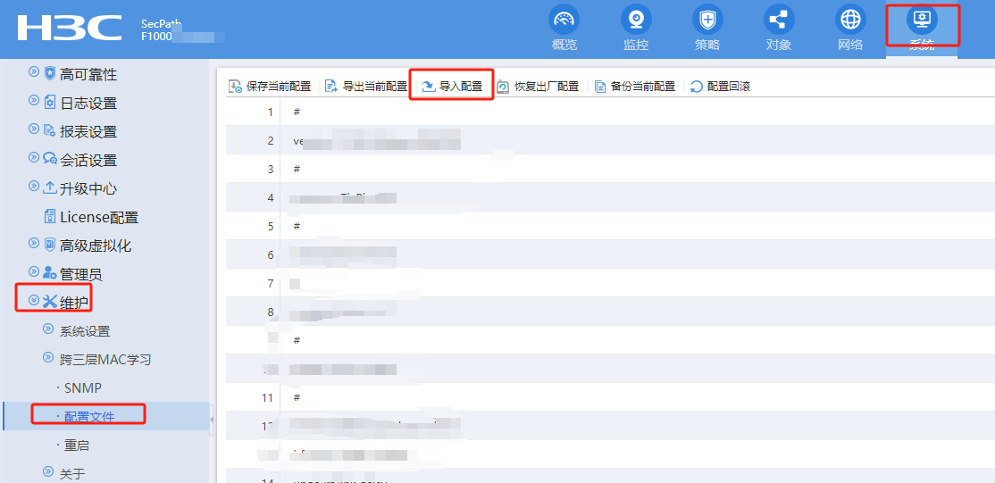 #由于误操作导致配置丢失,可以导入之前备份的文件,还原设备配置,选择“系统”>“维护”>“系统设置”>“配置文件”点击“导入配置”。