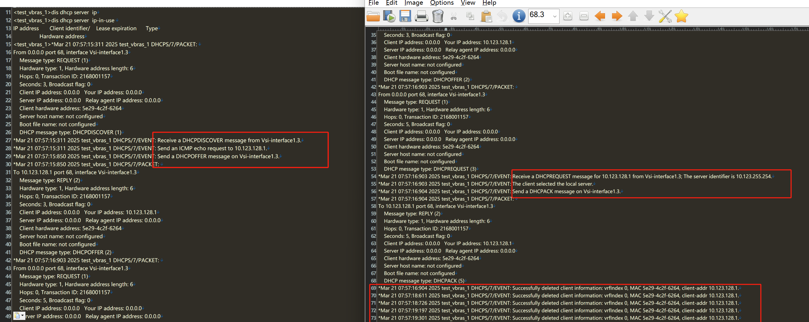 dhcp:dhcp ip in-use看不到占用,显示已过租期,dubug发现dhcp流程报文都具备。终端拿到地址后开始一直弹日志Successfully deleted client information。请大佬帮忙瞧瞧什么原因