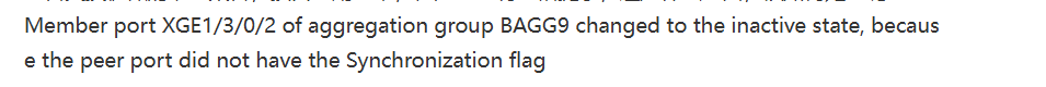 Member port XGE1/3/0/2 of aggregation group BAGG9 changed to the inactive state, because the peer port did not have the Synchronization flag