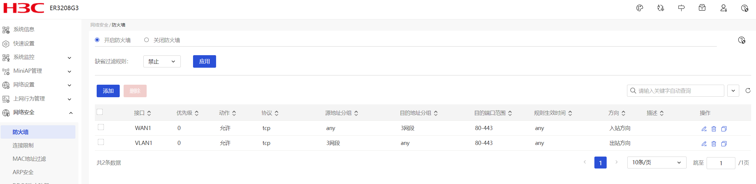 在路由器的防火墙设置里面,开启防火墙后,缺省过滤规则选择禁止,配置了如下放通规则,放通80-443端口后,电脑访问不了网页。如果缺省过滤规则选择允许,禁止除了80、443端口以外的所有端口后,网页可以访问,其他被端口被禁止。这是什么情况,是这个缺省过滤规则不能使用禁止吗?