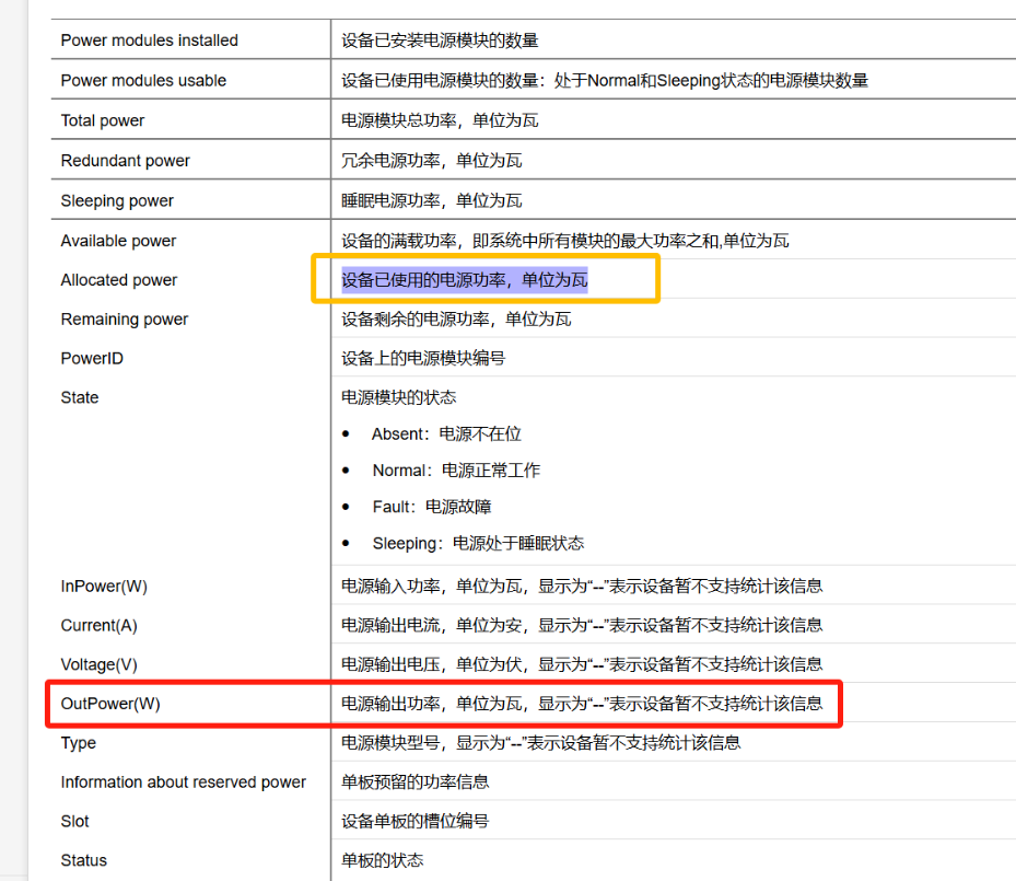 在 H3C 设备(如交换机、路由器等)的 display power 命令输出中,通常会有以下两个关键参数: