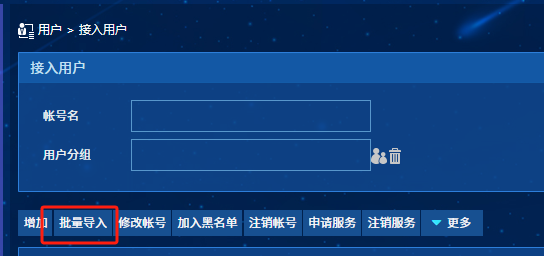 (1)用户>接入用户管理>批量操作>下选择批量导入账号,见图一。点击下一步,点击账号导入模板下载稍后导入用户使用的模板文件,见图二。图三为获取到的用户导入模板文件。