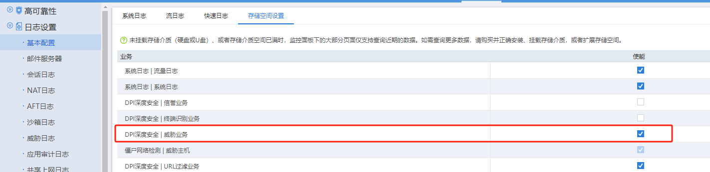 2、在系统--日志设置--基本配置--存储空间页面查看威胁业务是否使能