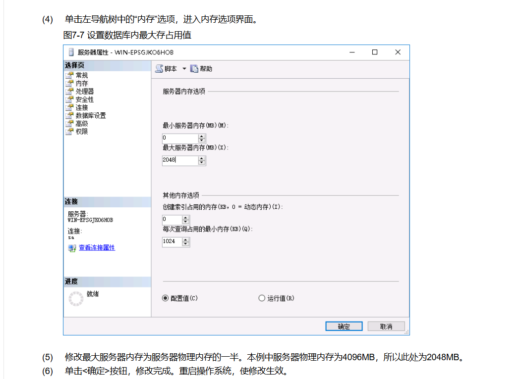 1.2 SQLServer最大服务器内存检查 检查最大服务器内存,若没有设置(该值为默认值2147483647就认为没有设置),给出提醒不符合推荐配置,但可以继续安装。 我看检查说明里面说这句话是不是意味着这个整改项不用整改?数据库是使用内嵌的数据库默认设置没有修改过
