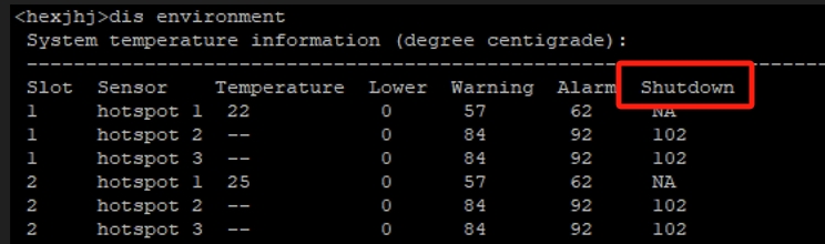 display environment命令用来显示设备的温度信息,包括设备当前温度和温度门限。