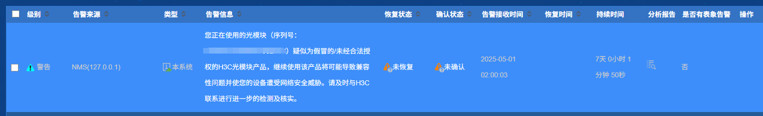 客户局点IMC全部告警中,出现光模块防伪警告,告警来源NMS(127.0.0.1),经确认光模块都为正品,客户想了解为何有此告警来源,并且去除告警