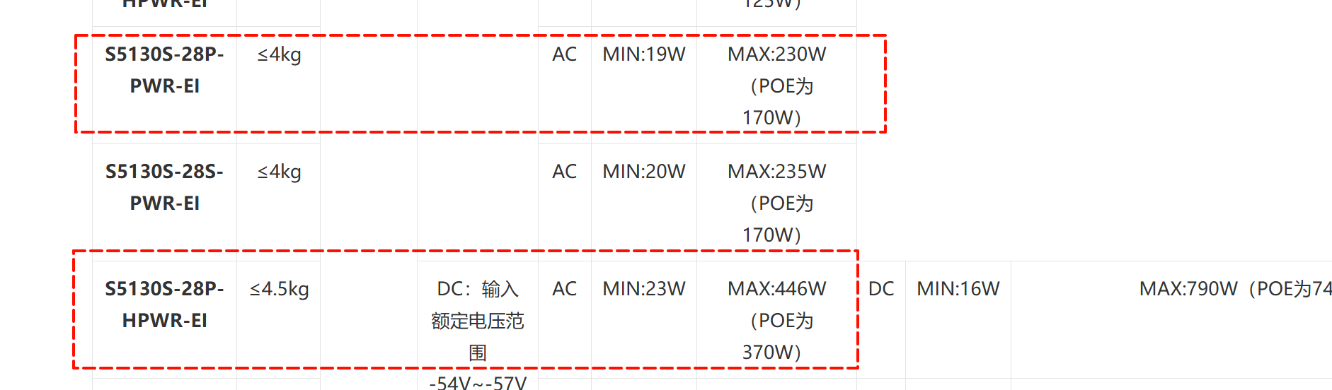 - **H3C S5130S-28P-PWR-EI**:支持802.3at,单端口30W,总功率370W。