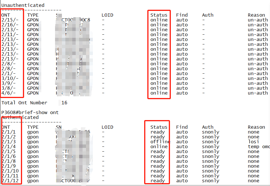 Ready 表示已经注册成功可以正常传输数据,Online没上线onu物理连线在1/6口,但olt上却强制注册在1/3口,导致的onu软件注册和实际注册的位置不一致,导致注册不上的问题。