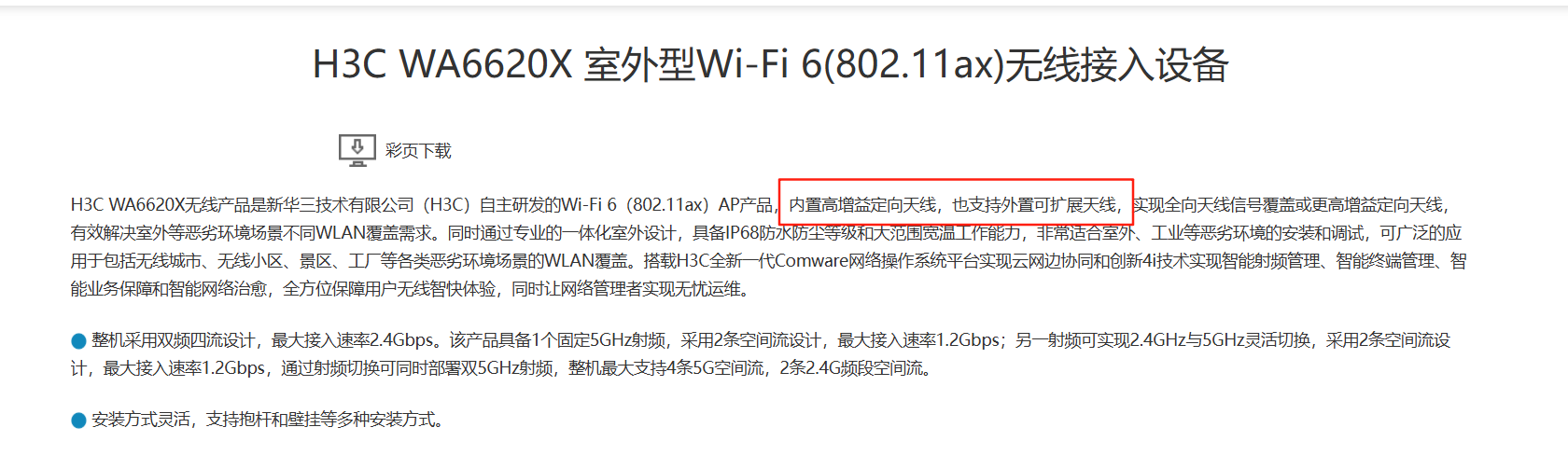 1. 室外AP WA6620X可以实现5G射频安装外置定向天线,2.4G安装全向天线进行无线覆盖,但需确保天线和射频电缆符合当地法规,且满足射频电缆电压驻波比(VSWR)不高于1.4,天线电压驻波比(VSWR)不高于1.8的基本指标。同时,为了保证信号质量和覆盖效果,建议射频功率配置不超过90%,并考虑升级至Comware V7平台R5446P06或Comware V9平台E1046P01及以上的版本。