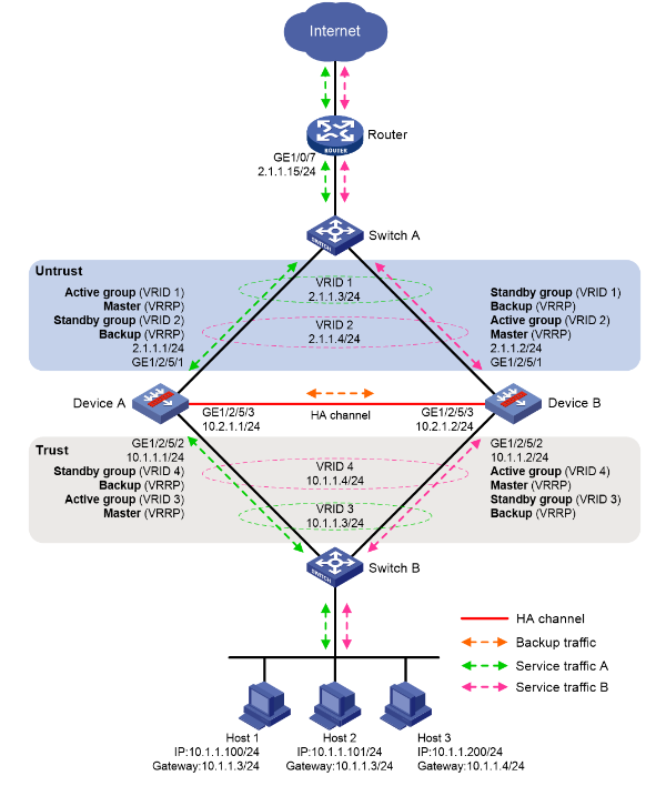 #FW2此部分配置与FW1类似。 # interface GigabitEthernet1/0/1 port link-mode route ip address 10.0.0.2 255.255.255.252 vrrp vrid 1 virtual-ip 200.0.1.1 255.255.255.0 standby # # interface Route-Aggregation1 ip address 10.0.1.2 255.255.255.0 link-aggregation mode dynamic vrrp vrid 10 virtual-ip 10.0.1.1 255.255.255.0 standby # interface GigabitEthernet1/0/4 port link-aggregation group 1 # interface GigabitEthernet1/0/5 port link-aggregation group 1 |