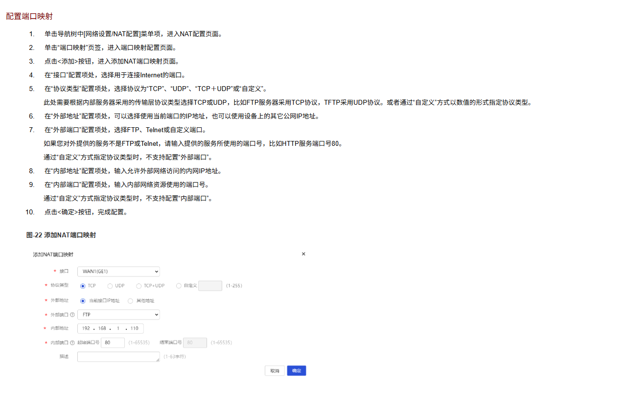 将内网服务器映射到公网,使得公网侧的用户可以通过MSR路由器的WAN接口+端口号来访问内网的WEB服务器,本案例中,服务器的服务端口为80,服务器内网地址为192.168.1.100,路由器外网地址为1.1.1.1,映射的外网端口为8080。