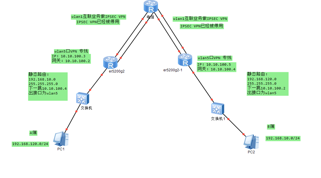 ER5200G2 A点和B点是通过路由器IPSECVPN来连接的,,现重新拉VPN专线,现在客户端想通过VPN专线互相访问,A点路由器WLAN5口 配置电信提供的IP10.10.100.3,网关10.10.100.2,客户端为192.168.120.0/24 ,A端静态路由网关10.10.100.4,出接口wlan5...B点路由器WLAN5口 配置电信提供的IP10.10.100.5 网关10.10.100.4,客户端192.168.10.0/24,B端静态路由网关10.10.100.2,出接口wlan5...,IPSECVPN停用后双方PING,