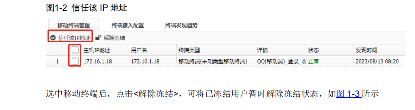 • 若启用了信任用户功能(trust-user enable),仅信任IP地址的终端会被放行,非信任IP的终端可能被冻结或过滤,导致无法显示。