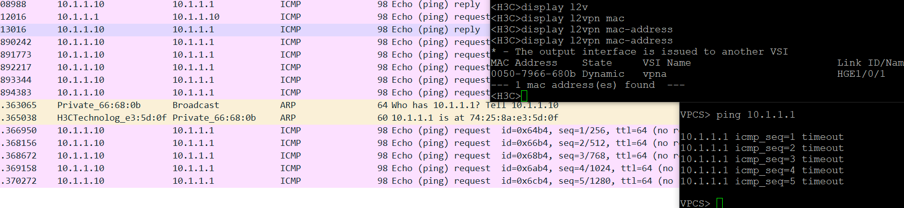 问题:可以看截图啦,vpc ping不通网关,但是能学些到网关arp,网关上查看VSI学习到mac地址,也能看到对方。抓包可以看到s